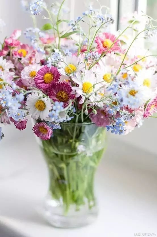 用小口径的花瓶装花,大小正好把鲜花的茎装下,这样水分就会蒸发慢一些。