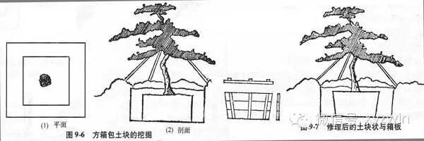 挖前先用3根长杉槁将树干支牢。以树干为中心,按预定扩坨尺寸外加5cm划正方形,于线外垂直下挖60 -80cm的沟直至规定深度(图9-6)。将土块四壁修成中部微凸比壁板稍大的倒梯形(图9-7)。遇粗根忌用铲,可把根周围土稍去成内凹状,并将根锯断,不使与土壁平,以保证四壁板收紧后与土紧贴。
